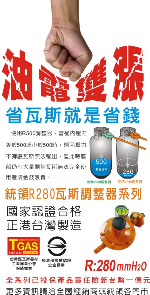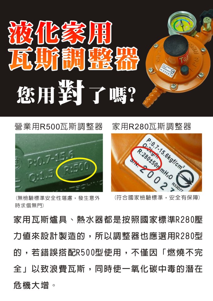 打開瓦斯爐,若氣體燃燒不完全,容易引發瓦斯氣爆和一氧化碳外洩,危險性極高,因此經濟部為了民眾的居家安全,要求從四月一號開始,所有新申請的瓦斯爐、瓦斯烤箱及瓦斯熱水器,都必須適應新的規格要求,調節器改用新款R280,不只更安全也更節能。